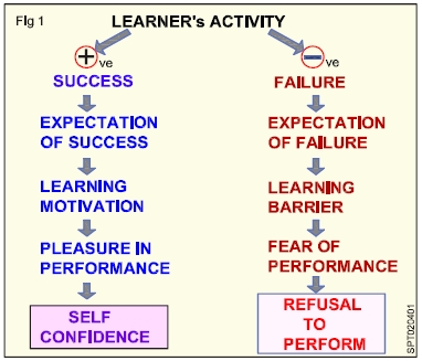 Reinforcement plays an important role in influencing the learning process. Reinforcement occurs when the learner can see that his efforts have led to success. A person who has such a pleasant experience of success will understandably have a tendency to repeat the activity again and again. In this way successful learning can lead to a continuous renewed willingness to learn. A person whose efforts have met with failure for long duration and frequently will have an expectation of failure before every new learning situation. This negative reinforcement acts as a barrier to learning. (Fig 1)